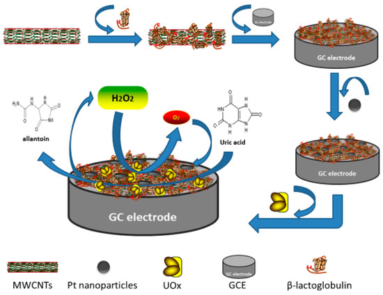 In this work, a simple and highly selective electrochemical biosensor for determination of uric acid (UA) is synthesized by using β-lactoglobulin (BLG)-functionalized multiwall carbon nanotubes (MWCNTs) and a platinum nanoparticles (PtNPs) nanocomposite. Urate oxidase (UOx) can oxidize uric acid to hydrogen peroxide and allantoin, which provides a good opportunity for electrochemical detection for UA. Under the optimized conditions, the current changes by the UOx/Bull Serum Albumin (BSA)/BLG-MWCNTs-PtNPs/Glassy Carbon (GC) electrode with the electrochemical method was proportional to the concentration of UA. According to experiments, we obtained a linear response with a concentration range from 0.02 to 0.5 mM and achieved a high sensitivity of 31.131 μA mM−1 and a low detection limit (0.8 μΜ). Meanwhile, nanoparticles improved the performance of the biosensor and combined with BLG not only prevented the accumulation of composite nanomaterials, but also provided immobilization of uricase through electrostatic adsorption. This improves the stability and gives the constructed electrode sensing interface superior performance in UA detection.