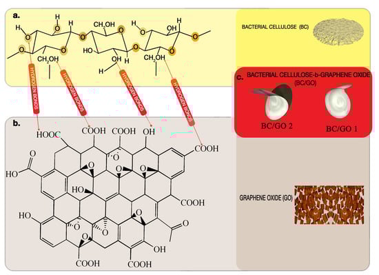 Synthesis of BC/GO membranes and their chemical structures. (a) Bacterial Cellulose (BC), (b) structure of Graphene oxide (GO) and (c) BC/GO (composites 1 and 2), obtained after hydrogen bonding and entanglement.