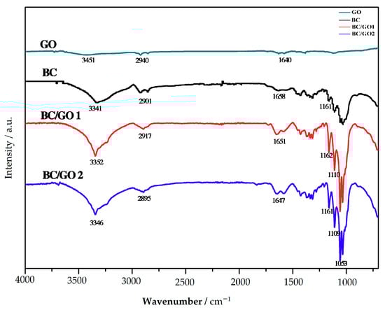 FTIR spectra of GO, BC, BC/GO 1 and BC/GO 2.