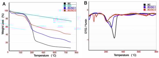 The thermal stabilities of the BC/GO nanomaterials were evaluated using thermogravimetric analysis (TGA). Almost all sample curves show their first mass loss from room temperature to 100 °C, confirming the presence of water. As shown in Figure 3A, GO shows a continuous steady weight loss of about 28.8% when heated to 800 °C, this could be attributed to some organic group defects on the surface of the GO sheets compared to BC which shows intermittent irregular weight loss; first slightly at a temperature <50 °C. Then, a slow loss to <250 °C (at around 89%) before a further large weight loss (about 74%) to 360 °C, and a final 14% weight loss at 800 °C as a result of depolymerisation and the decomposition of the cellulose backbone. Both BC/GO 2 and BC/GO 1 composites experienced a couple of additional weight degradation steps during the thermal process with a mass retention of 42% at 800 °C; the presence of a good amount of GO may contribute to this retention capability. BC/GO 1 compared to BC/GO 2 shows slightly fewer steps in degradation with the percentage of retention seemingly lower than BC/GO 2 at 800 °C, which was at 24%.