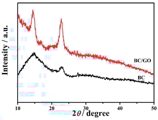 The crystalline structure of the prepared samples was characterised by X-ray diffractograms of cellulose, presented in Figure 4. Typical peaks are easily observable in sample patterns of BC; 2θ = 14.2°, 23.1° and a small peak at 28°, which were consistent with diffraction (110) and (200) planes of cellulose I. BC/GO exhibits similar diffraction peaks at 2θ = 14.1°, 22.8° and a small peak at 28° at a somehow higher intensity with no significant peaks shifting or no appearance of new peaks. The higher intensity can be attributed to the introduction of GO onto the surface of BC as they (GO) are evenly dispersed on the surface inside the BC matrix. This also confirms the physicochemical modification of the BC, helping to enhance the degree of crystallinity of the BC to about 20–30%. The chemical modification purportedly occurs at the surface of the cellulose fibres []. Further data information is offered to support the nature of the thermal stability of the materials (BC/GO 1 and BC/GO 2) divulged by the TGA results in Figure 3a,b.