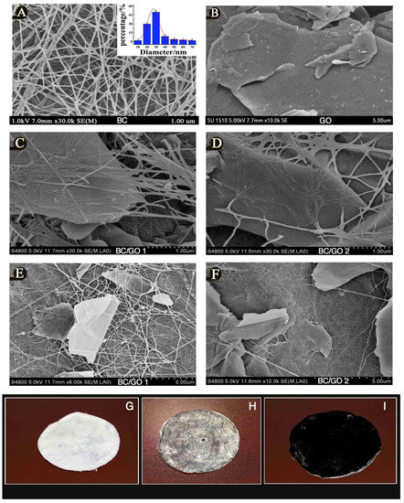 SEM images of pristine BC, BC/GO 1 and BC/GO 2 samples are displayed in Figure 5A–F, with BC showing a nanoporous three-dimensional morphological network structure. The microfibrils are randomly arranged by overlapping and intertwisted cellulose ribbons in irregular planes across the span of the membrane with nanosized empty spaces between them []. BC/GO 1 and BC/GO 2 provides a good understanding of how GO is introduced into the matrix of BC during synthesis. Typical BC features the archetypal three-dimensional nanosized spaces between the filaments, which is further elucidated by the inserted graph on Figure 5A. The filament size is between 10 to 70 nm according to the insert on Figure 5A. Figure 5B shows GO sheets that are well exfoliated along the planes and evenly distributed across the entire membrane area, appearing clean and smooth. Figure 5C,E represent BC nanofibrils successfully cross-linked with GO sheets in a manner physically seen as entanglement but also chemically explained by the covalent bonding interaction between the reactive groups and the intercalation of GO sheets with BC fibers; typically, the images representing BC/GO 1. The same can be described for BC/GO 2, see Figure 5D,F; however, it contains more GO than BC/GO 1. GO sheets are clearly interlocked within the 3D web-like arrangement of the BC nanofibrils; which occurs during the formation of the structure by the in situ cultivation approach. BC/GO 1 and BC/GO 2 images depict similar SEM images and can be explained by the same mode of composition; chemically, as covalent bonding occurs between the reactive groups of both BC and GO. However, a slight difference can be seen from the photographed images in Figure 5G–I with regard to the appearance of both materials. As purposely engineered during the entanglement process in the culture medium, a greater amount of GO is evidently trapped on the surface of the liquid medium face beneath the BC of BC/GO 2. This explains the coin-effect (plain on one side/black (GO) on the other side).