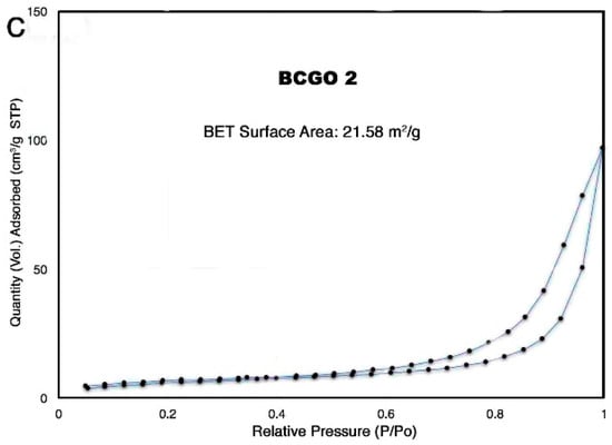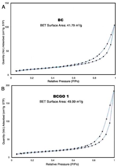 To determine the specific surface area of the adsorbent materials, measurements were performed on a surface area and pore analyser Micromeritics TriStar II 3020 (Micromeritics Instr. Corps., GA, USA) using N2 adsorption–desorption isotherms at 77.35 K. Samples of BC, BC/GO 1 and BC/GO 2 were degassed at 30 °C for 24 h under vacuum at 0.016 mmHg prior to measurement. The N2 amount adsorbed and desorbed onto samples were measured over a wide range of relative pressures (P/P0 = 2 × 10−5–1.0), whereby P represents the equilibrium pressure and P0 is the saturation pressure. The specific surface area was determined and calculated using the Brunauer, Emmett and Teller (BET) method and equation [], while pore size distributions were evaluated according to the Barrett, Joyner and Halenda (BJH) method [].