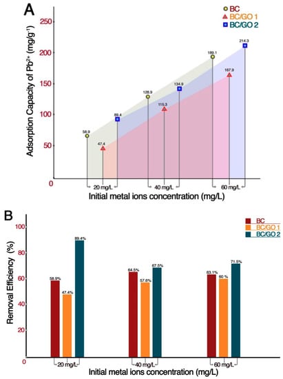 The adsorption behaviour of the prepared composite materials BC, BC/GO 1 and BC/GO 2 for Pb2+ metal ions (mono-component systems) were evaluated on experimental parameters such as the initial concentration of metal ions, pH, adsorbent dosage and contact time. Some of the factors affecting the adsorption of heavy metal ions on the surface of GO include oxygenous functional groups in both the adsorbent and adsorbate, the thickness of the GO, the species of heavy metal ions in solution and the experimental conditions. It had been confirmed that the oxygenous functional groups on the GO surface played an important role in the adsorption [].