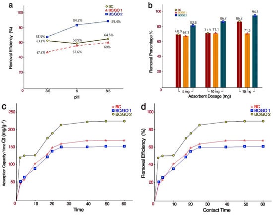 Figure 8c,d show a sharp adsorption or uptake within the first 5 min for all the materials with BC/GO 2 expressing high values with time compared to BC, with BC/GO 1 showing the lowest adsorption capacity of the three. Similar uptake speeds can be identified for all samples as adsorption is sharp for the first 5 min and steadily rises from 10 min and begins to experience equilibrium from 28–30 min. The reason for the sharp uptake within 5 min could be due to the free surface area of the materials available for bonding with the metal ions. However, as time increases and surface reactive areas are sufficiently occupied through bonding exhaustion, the uptake plateaus, showing that it has reached equilibrium. An uptake equilibrium in all the material adsorption cases begins at 28 min and is maintained as time progresses.