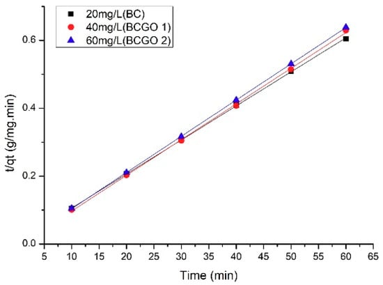 Figure 9 depicts the corresponding PSO for Pb(II) ion adsorption on to BC, BC/GO 1 and BC/GO 2 because it agrees with the linear regression plotting chosen for this experiment whereas PFO did not conform. Both PFO and PSO were used to model the adsorption rate of metal ions onto the surface of prepared membranes at pH 6–8 (experimental optimum) at 25 °C and 130 rpm. Using origin Pro 2016 software, the kinetic data, shown in Table 2, was modelled by linear regression analysis using a PFO and PSO equation model. It was discovered that the adsorption data of Pb2+ on BC, BC/GO 1 and BC/GO 2 corresponded seamlessly with PSO, see Figure 9, and the plots show a high correlation coefficient (R2), complying well with trusted theoretical assumptions of the PSO.