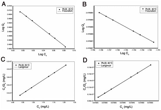 From experimental equilibrium data of the Langmuir (Qmax) and the Freundlich models (Qmax), the maximum metal ion adsorption capacity of the adsorbent exhibited the following order: Pb2+ 40 °C-Langmuir > Pb2+ 25 °C-Langmuir, whereas Pb2+ 40 °C-Freundlich > Pb2+ 25 °C-Freundlich; which could be seen from plots in Figure 10, suggesting that the adsorbent is more of a monolayer homogeneous adsorption material rather than being heterogeneous.