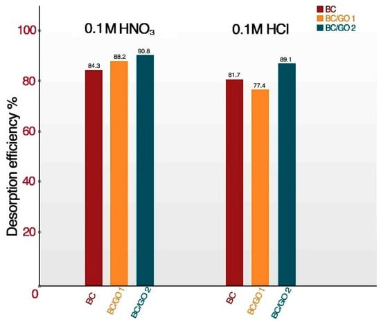 To understand and determine the reusability of as-prepared samples, 50 mg of BC, BC/GO 1 and BC/GO 2 composites were weighed into 100 mL Erlenmeyer flasks, and 30 mL of Pb2+ metal ion solution 60 mg/L buffered at pH 8 was added. Aliquots were separated by filtration after subjecting them to agitation with the use of orbital shakers at 24 °C for 3 h at 120 rpm. Optimum adsorption parameters were ensured considering the functions of contact time, pH (initial) of solution and the initial metal ions’ concentration. After filtering, they were washed with deionized water and the adsorption capacities were ascertained. After a while, the samples loaded with Pb2+ were weighed into a 100 mL Erlenmeyer flask and 20 mL of 0.1 M HNO3 and 0.1 M HCl were added and stirred for 5 min (130 rpm) at 24 °C. The final concentrations were detected with AAS. The determination of the desorption ratio was derived from the amount of metal ions adsorbed on adsorbent materials and the final PbCl2 ions concentration in the adsorption medium. The desorption ratio was calculated from the following Equation (8):