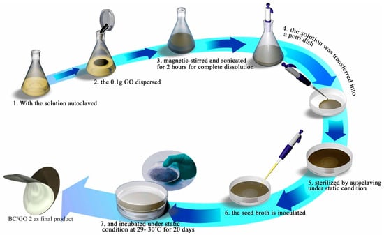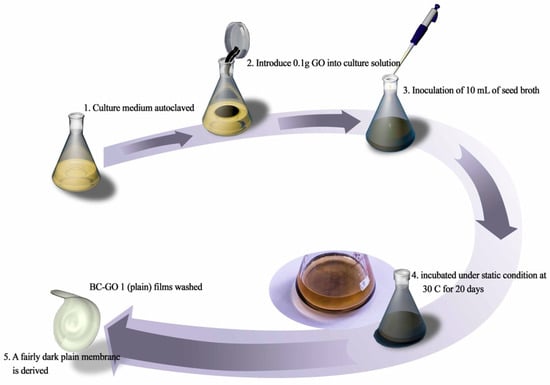 After this, 0.1 g of GO was deposited into the culture solution and magnetically stirred for 1 h before sonication for a further 2 h to ensure absolute dispersion; at this point 10 mL of the seed broth (Gluconacetobacter xylinus) BC was inoculated into a 500 mL Erlenmeyer flask containing 100 mL of GO dispersed medium. These flasks were then incubated under static conditions at 29–30 °C for 20 days.