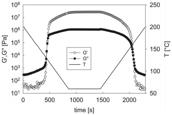 Rheological temperature ramps were performed under conditions similar to those used in calorimetric measurement. The sample is loaded at a temperature of 200 °C and, after thermal equilibration, is cooled at a fixed rate down to a temperature of 60 °C while measuring the linear viscoelastic moduli at the fixed frequency of 10 rad/s. Lower temperatures were out of range of the rheometer due to the increasing rigidity of the material. After an isothermal resting at 60 °C the temperature was increased again to the maximum value of 200 °C.