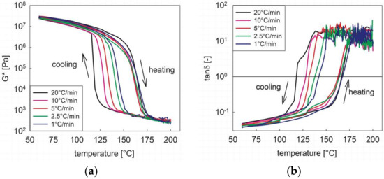In all processes involving a thermally induced phase change, the transitional phenomena depend on the temperature rate of change, as both thermodynamic and kinetic effects are present. Figure 4 shows the cooling/heating cycle (the holding phase data at 60 °C have been omitted to improve the clarity) at different rates, from 20 to 1 °C/min. The complex modulus, G* (Figure 4a), shows all the features already discussed above. At the highest rate of change (20 °C/min), the onset of phase transition upon cooling takes place to the lowest temperature. As the rate decreases, the transition takes place at increasingly higher temperatures, indicating that the phase transition kinetics upon cooling are becoming significantly less relevant compared to thermodynamic effects [31]. On the contrary, the dependence of the melting behavior upon the heating rate is not relevant, as the curves essentially superimpose and no clear trend is observed. It is also apparent that, at any cooling/heating rate, the sol-to-gel transition realized upon cooling the melt is much “sharper” than the corresponding melting process, in agreement with the calorimetric data shown in Figure 1. It can be deduced that the formation of the microdomains is a more difficult process than their symmetrical melting, thus giving more strength to the hypothesis that melting is determined by a progressive erosion of the hard phase domains, with a gradual loss of connectivity [30].