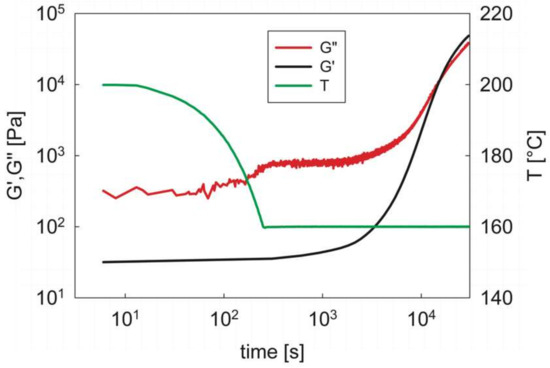 The results of a typical isothermal test are reported in Figure 5. Here, after sample loading at 200 °C, the temperature is rapidly dropped to the test temperature (in this case 160 °C) by a cooling ramp at 20 °C/min. When the target temperature is reached, the temporal evolution of the viscoelastic moduli at a fixed frequency is monitored. Notice that the G′ data have been smoothed, due to the high temperature data scattering (see above), simply to allow for a better reading of the results.