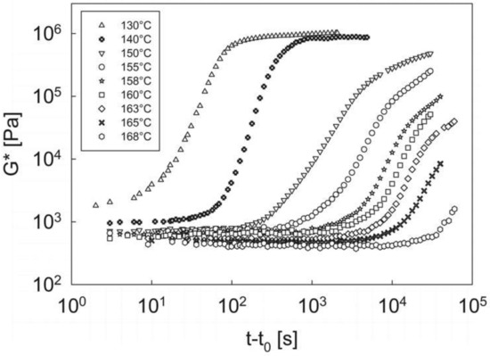 The message of Figure 6 is very clear: the kinetics of the phase transition process become faster as the temperature decreases, thus determining an earlier increase in the complex modulus evolution. Furthermore, although the long-time tail at the higher temperatures cannot be always captured due to the phase transition kinetics being too slow with respect to the experimentally affordable time window, the system seems to tend to an equilibrium value of the modulus. It is important to underline that, above the temperature of 168 °C (the highest temperature reported in Figure 6) no hint of phase transition is detected, at least for experimental times as long as about 105 s.