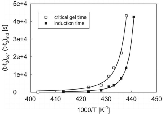 where t can be either the critical gel or the induction time, A is a numerical pre-factor, B is a pseudo-activation energy, TODT is the order-to-disorder temperature and T is the test temperature. The non-linear regression of Equation (2) to the data of Table 2 is reported in Figure 7, where the reduced characteristic times are both plotted as a function of the absolute temperature. The sets of parameters obtained from the regression procedure are listed in Table 3.