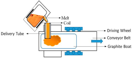 FeSi master alloy was prepared using medium-frequency induction melting. The thin sheet mother alloy was prepared with a moving graphite boat in a “3D printing” manner. The technological process of preparation is shown in Figure 1. The master alloy was milled by high-energy vibration ball milling and then the flaky FeSi alloy powder, with a sheet width of 75–150 μm and 45–75 μm, was obtained by sieving.