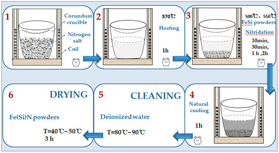The flaky FeSi alloy powder was immersed into the liquid reaction system, and the reaction times used were 10 min, 30 min, l h, and 2 h. After the natural cooling of the product, it was washed several times with deionized water at 80–90 °C to remove impurities on the surface of the powder. Then, it was dried at 40–50 °C to obtain a final product. The preparation process is shown in Figure 2.