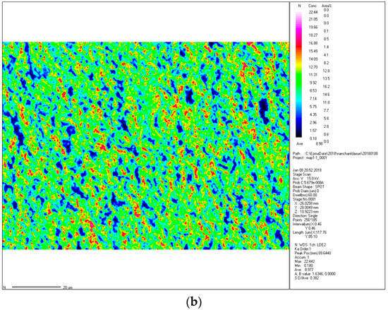 The nitrogen content was analyzed by using an electron probe microanalyzer (EPMA), which used a focused electron beam irradiated onto a small area of the surface of the sample to excite characteristic X-rays of the Fe element and the N element wavelength (energy) in the sample. Figure 5a,b depicts micro-area distribution maps of the Fe and N elements in the ε-Fe(Si)3N powder, respectively. In Figure 5, it is evident that the iron content is relatively large and well-distributed, and the Fe element cluster enrichment region is substantially the same as the N element cluster barren region. Combined with the above XRD pattern, it can be concluded that the Fe element takes the N element as the nucleation core and forms the ε-Fe(Si)3N phase in the nitriding process.