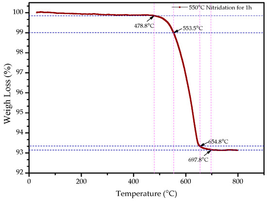 The thermal decomposition of nitrides should be considered as the weakened metal N bond broken by heat motion and N atoms combined into the strong nitrogen molecule. In order to better understand the thermal stability of nitriding powders, the thermal stability test was carried out using a synchronous thermal analyzer. Thermogravimetric analysis (TG) is a thermal analysis technique for measuring the relationship between the mass of the sample and the temperature change. Figure 6 shows the thermal analysis curve of the ε-Fe(Si)3N powder.