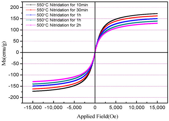 During the nitridation reaction, the diffusion of nitrogen atoms is mainly affected by temperature, defects, and N atomic chemical potential or [19]. The kinetics of the process of diffusion is strongly dependent on temperature. When the temperature of the nitrification system increases, the thermal energy that was supplied to the diffusing atoms permits the atoms to overcome the activation energy barrier, and they more easily to move to new sites. Therefore, the flux of atoms increases, as well. The XRD spectra also showed that the nitriding effect was better when the nitriding reaction time was shortened from 2 to 1 h and the nitriding temperature was raised from 500 to 550 °C. The saturation magnetization of the product was slightly higher than that of the product nitrided at 500 °C for 2 h, which was 139 emu/g. The detailed test results of the saturation magnetization of powders under different nitridation conditions are shown in Table 1.