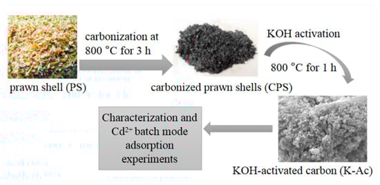 The tubular furnace process carbonization and KOH activation method were employed for preparing K-Ac adsorbents according to the method reported previously, with some modifications [39]. Firstly, the square crucible containing 20 g of raw prawn shell was placed in a three-zone tube furnace (Guangzhou Dijiduo Instrument Co., Ltd, Guangzhou, China). Then, nitrogen was introduced at a flow rate of 100 mL/min for about 1 h, followed by a 10 °C/min heating rate. After carbonization at 800 °C for 3 h, the residue was mixed with 1 mol/L HCl for 1 h. Subsequently, the residue was filtered, washed to neutrality, and dried for 8 h at 105 °C to give the prawn shell biochar (CPS). For activation, the mass ratio of potassium hydroxide and CPS 3:1 was uniformly mixed, and ground in a mortar. The mixture was then placed in a three-temperature zone tube furnace, and activated at 800 °C for 1 h. The residue was mixed with 2 mol/L HCl for 2 h. Finally, the residue was filtered, washed to neutrality, and dried for 6 h at 105 °C to obtain the modified prawn shell biomass carbon (K-Ac). The resultant K-Ac materials were used for characterization and Cd2+ adsorption studies. The production steps are illustrated in Figure 1.