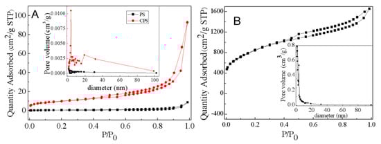 Nitrogen adsorption-desorption isotherm and pore size distribution of (A) PS and CPS; (B) K-Ac.