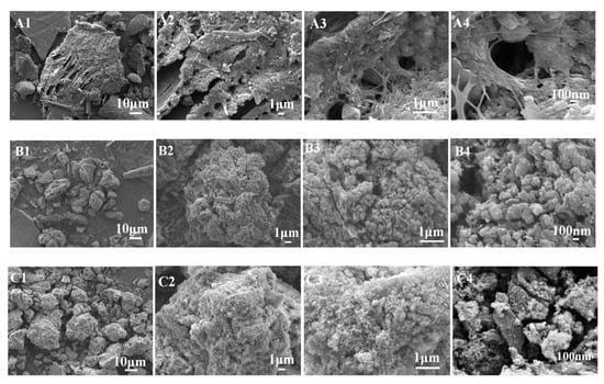 Observations with SEM: (A) PS (A1–A4: magnified ×5000, ×10,000, ×20,000, ×50,000, respectively), (B) CPS (B1–B4: porous microsphere-stacking structures of CPS with different magnification), and (C) K-Ac (C1–C4: nanopore structures of K-Ac with different magnification).