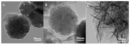 After treatment with 3 M HCl, morphologies of PS, CPS, and K-Ac could be observed by TEM, as illustrated in Figure 4. The results show that these three samples appear as a spherical shape with some sporadic distribution of pores, which is in accordance with the results of SEM. As shown in Figure 4A, the number of holes on the surface of PS is relatively small, the agglomeration of holes is not very obvious, and the aperture or pore size is relatively large. As illustrated in Figure 4B, the distribution of pores is homogeneous and abundant. As indicated by the BET results, the average pore size of CPS is 3.83 nm. As exhibited in Figure 4C, K-Ac shows a relatively regular aperture and an increase in the number of pores, with a more compact arrangement to render nanoporosity, and high specific surface areas. This is probably due to the interior etching process of KOH activation [51]. It has been indicated that KOH might promote the development of new micropores induced by KOH activation [28].
