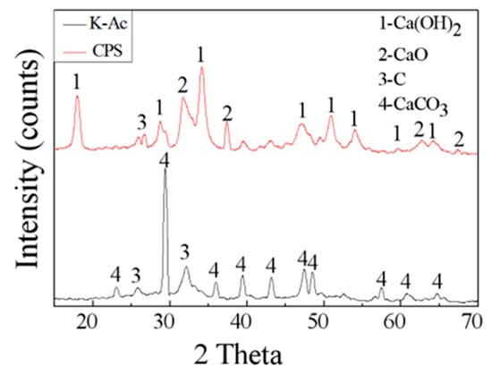 The crystalline structure of as-prepared samples is characterized by XRD. The XRD spectrum of CPS and K-Ac is presented in Figure 5. From Figure 5, it can be seen that almost all peaks of CaCO3 in PS became CaO (PDF# 78-0649), and the corresponding peaks are at 2θ = 32.203°, 37.346°, 53.854°, 64.152°, and 67.373 [52,53]. Since CaO reacts easily with H2O in the air and becomes Ca(OH)2, there is a characteristic peak of Ca(OH)2 (PDF# 87-0673) in the XRD pattern of the untreated adsorbent [10], and its corresponding characteristic spectra are at 2θ = 18.089°, 28.662°, 34.088°, 47.123°, 50.794°, 54.336°, 62.538°, and 64.226°. In addition, the strong diffraction peak at 26.381 may have been caused by the partial ordering of carbon, and there is a less pronounced amorphous diffraction peak around 31°, which may be residual amorphous carbon. Compared with K-Ac, the number and intensity of characteristic diffraction peaks decreases after KOH activation. The corresponding characteristic peaks are at 2θ = 23.022°, 29.405°, 35.965°, 39.401°, 43.145°, 47.489°, and 48.512°, indicating that the degree of crystallinity decreases. There is a distinct characteristic peak in the spectrum at about 2θ = 25°, and a faint characteristic peak at 2θ = 42°, which are the diffraction peaks of microcrystalline (002) and (100) crystal planes in the structure of disorder layer graphite, respectively. The diffraction peaks corresponding the (002) crystal plane are broader in the spectrum, indicating the amorphous state of K-Ac. The (100) peak of K-Ac is flat or almost disappears, and shows a diffusive shape with a large diffraction angle, which indicates that through KOH activation, K-Ac has a disordered crystallite layer, disordered carbon structure, and a smaller size of graphite-like crystallites, which may suggest strong adsorption capacity [54,55,56].
