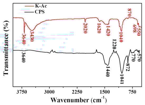 FTIR vibrational spectra of CPS and K-Ac are presented in Figure 6. For CPS, it can be seen from Figure 6 that CPS peaks at 1440 cm–1 and 1041 cm–1 are characteristic peaks of calcium carbonate, and the out-of-plane vibrational deformation peak of CO32– appears near 872 cm–1. The main intense bands of K-Ac are observed at 3640 cm–1, 3430 cm–1, 1420 cm–1, and 1040 cm–1. There are no major changes in the location of main absorption peaks, indicating their specific similar chemical structure. The peak at 3640 cm–1 is the characteristic infrared peak of Ca(OH)2. At the same time, a large number of –OH stretching vibration peaks appear at 3430 cm–1, representing hydroxyl groups (vibration frequencies of water, alcohols, and phenols) and N–H stretching vibrations. Two broad peaks are located in the range 1620–1380 cm–1, which can be assigned to the vibration of C=C bonds in aromatics and aromatic C–O stretching. The 1440 cm–1 peak shifts to 1420 cm–1, and the enhanced peak intensity at 1040 cm–1 is a characteristic peak of calcium carbonate. From the above analysis, it suggests that the KOH modification does not completely change existing groups on the surface of adsorbent CPS; however, after modification, the functional groups favoring metal adsorption, such as the hydroxyl groups, increase greatly, and the adsorption capacity of modified samples (K-Ac) to heavy metals is enhanced significantly. The reason for this may be that the large specific surface area, porous structure, and good adsorption properties of K-Ac are increased and promoted by KOH activation at high temperatures [57,58,59].