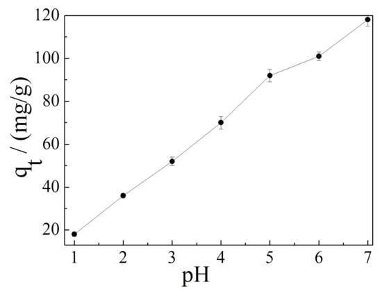 It is well-known that pH value is a key factor for promoting or restraining the adsorption process because it can affect the existence and the surface charge of the adsorbent [60,61]. As shown in Figure 7, the adsorption capacity of Cd2+ on K-Ac is significantly dependent on pH values. With the increase of pH value in the solution, the adsorption capacity of K-Ac to Cd2+ increases. When the pH value is 7, the adsorption amount of K-Ac is as high as 120 mg/g. The results clearly illustrate that the pH values have affected the functional groups or charges on the surface of the adsorbent. Under an acidic condition, the solution contains a large number of H+ ions. These H+ ions will occupy the adsorption sites on the surface of the adsorbent, which in turn will cause Cd2+ to be unable to precipitate on the surface of the adsorbent, weakening its adsorption capacity. On the other hand, the H+ ion concentration decreases as pH increases, the H+ ions do not compete with Cd2+ anymore, and there are more active groups and active sites available; thus, Cd2+ ions can obtain more OH− ions in the solution. Generally, the adsorption capacity of heavy metals by an adsorbent increases with an increasing pH value. When the pH value is higher than the critical pH value of a heavy metal, hydrolysis and precipitation are dominant in the solution [62]. The critical pH value of Cd(II) ion is around 8.0 [63].
