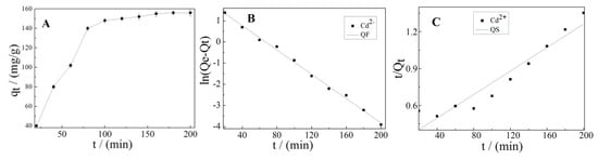 (A) Effect of contact time for Cd2+ adsorption by K-Ac; (B) adsorption kinetics of Cd2+-fitted quasi-first-order rate model; (C) adsorption kinetics of Cd2-fitted quasi-second-order rate model.
