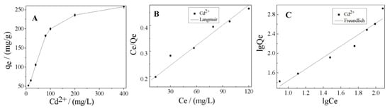 where Qe and Qm (mg/g) are the adsorption amounts when reaching equilibrium and the monolayer adsorption capacity, respectively. Ce (mg/L) is the liquid phase concentration of Cd2+ at equilibrium. KL and KF (mg/g) are the Langmuir and Freundlich equilibrium kinetic models, respectively; n (dimensionless) is a constant related to the nature and the intensity of adsorption; RL is a non-dimensional separation factor, which can predict whether the adsorption isotherm form is favorable to the adsorption process between the adsorbate and adsorbent (if RL > 1 indicates that it is not suitable for adsorption, RL = 1 means that the isotherm form is linear; 0 < RL < 1 indicates that it is suitable for adsorption; and RL = 0 is irrelevant [41]).
