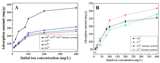 The adsorption capacities of K-Ac in the Cu2+, Cr6+, and Cd2+ ternary system and in their single systems are shown in Figure 10. The experimental results illustrated that the adsorption performance of K-Ac for metal ions in the multi-component heavy metal ion system was different from those in a single system. The adsorption amount of metal ions in single systems and the total adsorption amount of metal ions in a ternary system are shown in Figure 10A. As the initial concentration of the three metal ions increases, the adsorption amount of K-Ac gradually reaches equilibrium, and the order of sorption is Cr(VI) (318 mg/g) > Cu (280 mg/g) > Cd(II) (256 mg/g). As shown in Figure 10A, for the ternary system after equilibrium, the total adsorption amount of K-Ac for the three ions is 560 mg/g, which is about two times greater than that in the single system, but not the superimposed sum of ions adsorbed in their single ion system. It is suggested that for the adsorption experiments in the ternary system, there would be a competitive relationship among the three ions, which will affect the adsorption of metal ions by K-Ac. Furthermore, in the ternary system, as the initial concentration of the metal solution increases, the adsorption amount of Cd2+ by K-Ac was almost unchanged, while the adsorption capacity of Cr6+ was greatly decreased, as shown in Figure 10B, which is the individual adsorption amount of each metal in a single system and a ternary system. Compared with the single system, the adsorption amount of Cd2+ by K-Ac in the ternary system was slightly reduced in the same condition, indicating that the presence of Cu2+ and Cr6+ had little effect on the adsorption of Cd2+ by K-Ac. The adsorption capacity of K-Ac for Cr6+ in the ternary system was lower than that in the single system, suggesting that the presence of Cu2+ and Cd2+ had a strong antagonistic inhibition effect on the adsorption of K-Ac to Cr6+. Meanwhile, the difference in the adsorption capability of K-Ac to each heavy metal ion can be expressed by the ratio of adsorption amounts, i.e., Q3/Q1 (where Q3 is the adsorption capacity of K-Ac to a certain heavy metal ion in the ternary system; Q1 is the adsorption capacity of K-Ac to corresponding metal ions in a single system). The Q3/Q1 ratio of Cd2+ was approximately equal to 1, and the value of Cr6+ was much less than 1, which indicated that the adsorption of Cd2+ by K-Ac was not affected by interfering ions Cu2+ and Cr6+, while by the presence of Cd2+ and Cu2+, the adsorption of Cr6+ by K-Ac was inhibited to some extent; thus, the adsorption amount of Cr6+ was reduced. However, the total adsorption capacity of K-Ac for three metal ions in the ternary system could reach up to 560 mg/g, which was higher than that of the single heavy metal ion. From these data, it can be inferred that in the ternary system, the adsorption capacity of copper becomes the lowest due to the presence of Cd2+ and Cr6+ ions, and the adsorption capacity of copper drops from 280 to 24 mg/g.