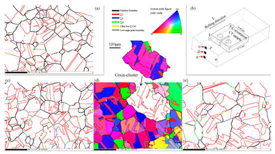 The microstructures, which were measured using EBSD, of the conventional (non-GBE) 316L stainless steel and of the same material after GBE processing are shown in Figure 1. One position (Figure 1a) was measured on the middle of the non-GBE sample’s cross-section, considering it should have a uniform microstructure. Three positions (Figure 1c–e) were measured on the GBE sample’s cross-section to check the uniformity of the GBE microstructure. The positions are shown in Figure 1b.