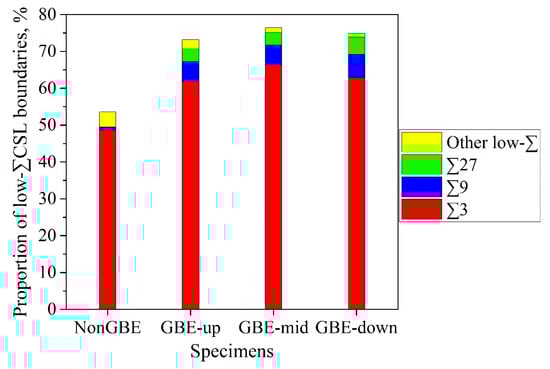 The EBSD maps in Figure 1 demonstrate that the GBE sample has a higher fraction of low-∑ CSL boundaries than the non-GBE sample as obtained by past studies [21,33,34,35,36]. The fractions of low-∑ CSL boundaries are 73.2%, 76.4%, and 74.9% for the upper, middle, and lower positions in the GBE sample, respectively, as shown in Figure 2. The average fraction of low-∑ CSL boundaries in the three maps of the GBE sample is 74.8% (boundary length fraction), and the average fraction is 53.6% for the non-GBE sample. In comparison, the three positions in the GBE sample have a similar microstructure with a similar high fraction of special boundaries, suggesting that the GBE sample has a uniform microstructure through the cross-section, although the thickness of the sample is quite large (19 mm). The process of warm rolling with a low strain deformation plus annealing is a favorable thermomechanical procedure for large-size samples in terms of GBE.