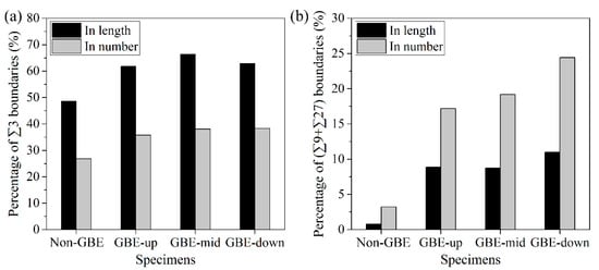 Length fractions and number fractions of (a) twin boundaries (∑3) and (b) ∑9 plus ∑27 boundaries in the non-GBE and GBE samples.