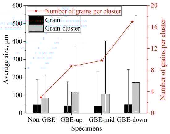 Grain cluster sizes are widely measured when one evaluates the microstructures of GBE materials [24,25,26,27,28,29]. The large size of grain clusters is a prominent feature of GBE-processed microstructures. For example, the size (equivalent circle diameter, the same below) of the grain cluster highlighted in Figure 1d is 335 μm. Figure 4 shows the average sizes of grains and grain clusters in the non-GBE and GBE samples. Although the GBE sample has a slightly smaller average grain size (42.1 μm) than the non-GBE sample (47.0 μm), the GBE sample has much larger grain cluster sizes (132.2 μm on average) than the non-GBE sample (83.4 μm). The grain cluster size distributions are quite non-uniform. Some grain clusters have extremely large sizes. The size of the largest grain cluster in the GBE sample is more than 546 μm, which is beyond the view of EBSD mapping.