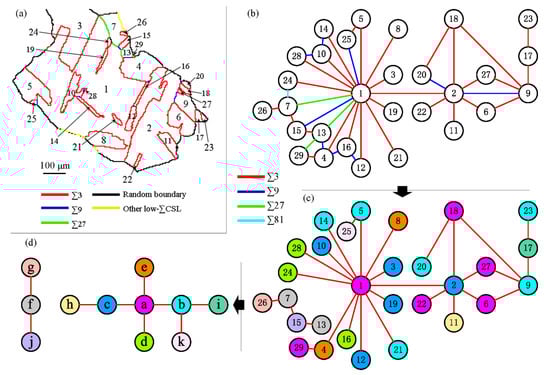 As a grain cluster is formed by multiple-twinning, all grains within it can be connected by a twin-chain. For example, Figure 5 shows the twin-chain of the grain cluster highlighted in Figure 1d. The grain cluster has 29 grains which were labeled using Arabic numerals following the order of area from large to small. Figure 5b topologically shows the topology of the GB network between the 29 grains. All the boundaries are ∑3n-type in terms of CSL theory. Figure 5c shows the twin-chain between the 29 grains, in which other types of boundaries were omitted but for the twin boundaries according to Figure 5b. Grains 7, 13, 15, and 26 are not connected with the other grains by twin boundaries. This is caused by the two-dimensional (2D) characterization. Apart from the 29 grains, the grain cluster must include other grains, and then the four grains can be connected with the other grains by twin boundaries. This can be confirmed by three-dimensional (3D) characterization [20,27].