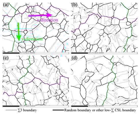 The TRBP indicates a pathway along which the intergranular degradation can propagate through the entire EBSD map, such as the pink highlighted pathways in Figure 6a. In this case, if the EBSD mapping field of view represents the whole microstructure of the specimen, the intergranular failures propagate through the specimen along the TRBPs, thus breaking the specimen. The map of the non-GBE sample (Figure 6a) has many TRBPs. In comparison, the numbers of TRBPs in Figure 6b–d (GBE sample) are less, and there is even no TRBP in the x-direction in Figure 6d. Therefore, GBE materials with a higher fraction of twin boundaries tend to have a fewer number of TRBPs.