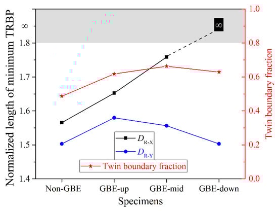 The DR-values of the four microstructures in Figure 6 are presented in Figure 7. The lengths of the minimum TRBPs were measured using ImageJ (v1.51s) [50]. A microstructure with a higher fraction of twin boundaries tends to have a larger DR (a further discussion is found in Section 4.2), but there is a difference between DR-X and DR-Y. The values of DR-X of the GBE sample are obviously larger than that of the non-GBE sample. The map of GBE-down has no TRBP in the x-direction, suggesting that intergranular failures cannot propagate through the view of the map in the y-direction.