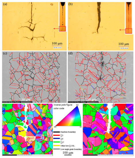 Profile maps of SCC propagation paths of the (a,c,e) non-GBE 316L and the (b,d,f) GBE 316L steel samples. (a,b) are metallographic maps; (c,d) are SEM maps overlaid with EBSD-measured GB networks; and (e,f) are grain orientation maps colored by inverse pole figure (IPF) code.