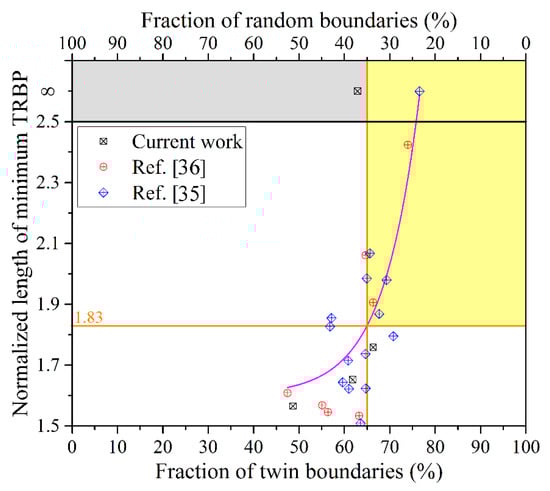 Figure 7 shows the minimum TRBPs and twin boundary fractions of the non-GBE and GBE samples. However, a universal relationship between the normalized length of minimum TRBP (DR) and the fraction of twin boundaries or random (corrosion-susceptible) boundaries is more informative, as shown in Figure 10. Some data published in our previous works [35,36] were cited in Figure 10, noting that only the TRBP in the x-direction was calculated and included here. The value of DR tends to increase monotonically as the fraction of the twin boundaries increases, particularly when the fraction is more than 65%. This result is in accordance with the percolation threshold value of a random boundary network that was determined by theoretical calculation by Schuh et al. [52] and by experimental statistics by Kobayashi et al. [1]. The DR is approximately 1.83 according to the fitting curve of these experimental data when the threshold value of the twin boundary fraction to interrupt the random boundary connectivity was estimated at approximately 65%, as shown in Figure 10. A higher DR indicates that the intergranular failure must pass through a longer zigzag path to propagate through a certain distance in a metal block; meanwhile, the zigzag path makes the propagation slower and more difficult [7]. Therefore, materials with a DR more than 1.83 and a twin boundary fraction more than 65%, that is, located in the yellow area in Figure 10, must have a much higher resistance to intergranular failure.