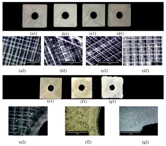 Figure 3(e1,f1,g1) are images of MM7520 printed parts manufactured with filaments immersed in water for 0, 10 min and 24 h. The printed part quality decreases significantly with respect to moisture affected filaments. The effects can be seen by a color and surface change from uniform transparent to white rough surfaces. This whiter surface has a high percentage of voids, as can be closely seen in Figure 3(e2,f2,g2). The images show that moisture trapping increases dramatically after only 10 min of water absorption.