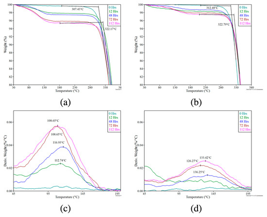 The TGA plots of moisture-saturated materials, MM4520 and MM7520, are presented in Figure 4a,b, respectively. The tests were done with samples that were first immersed in water for 0, 48, 72, and 112 h. Both the polymer matrices absorbed water and reached a saturation point after 72 h. Figure 4a,b also show the degradation temperature (Td). Both of the polymer samples started to decompose at ~300 °C. Therefore, thermal degradation of the polymers was independent of the absorbed water content. The most water evaporation (removal) occurs before 48 h, as seen by the greatest weight loss percentage in the TGA. After 72 h, weight loss gradually decreased and eventually stabilized.