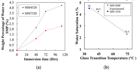 Figure 5a shows the water content (weight %) of MM4520 and MM7520 samples as a function of their immersion time in water. Plots were generated by calculating the water content values from Figure 4a,b data at around 240 °C, assuming that all weight loss was due to the evaporation of water and that the polymer became completely free of moisture. The plots indicate that MM4520 contained 4.22% moisture intake compared to 2.28% for MM7520 at saturation. The differences between SMP samples are due to the different amounts of soft segment content of each polymer.