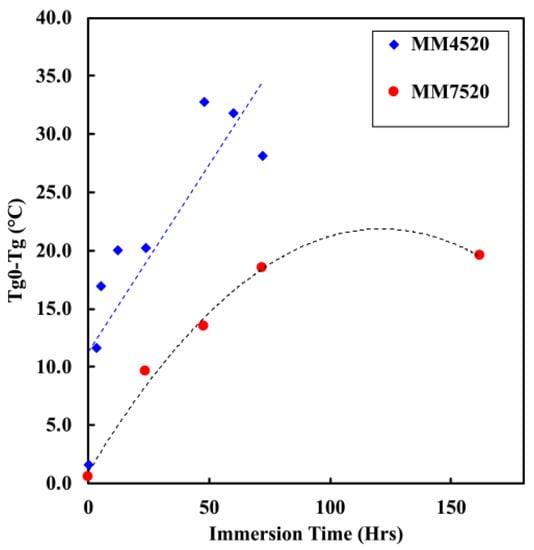 Graph showing a change in Tg with respect to immersion time in water for MM4520 and MM7520.