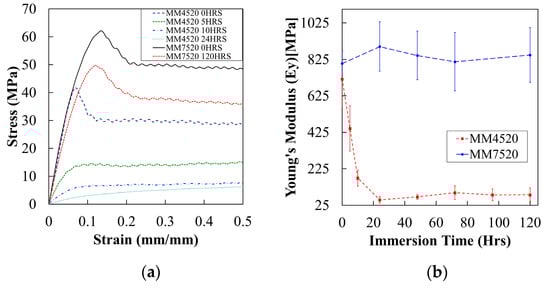 Figure 9b shows the elastic modulus (Ey), and one standard deviation at each side, obtained from tensile tests conducted for MM4520 and MM7520 with respect to immersion times in water. The elastic modulus of dried MM4520 (717 MPa) and MM7520 (803 MPa) did not differ significantly. Additionally, a rapid decrease of the elastic modulus for MM4520 was observed as immersion time in water increased. There was no significant effect for MM7520. The obtained difference between both polymers is given by a higher plasticization of the polymer with a lower hard-to-soft segment ratio (MM4520) compared to MM7520, just as it was seen by Yang et al. on a polymer with lower hard-to-soft segment ratio [27,29].