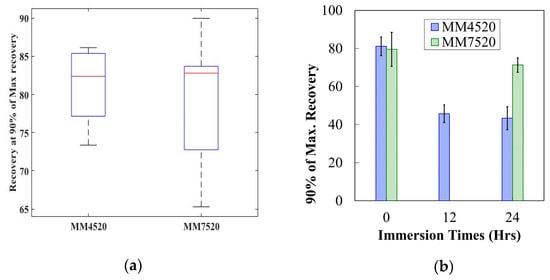 The tests showed that both materials recovered the same amount after being activated (Figure 12a). As moisture percentage increased, 90% of the maximum recovery decreased significantly for both materials, as portrayed in Figure 12b. The ANOVA returned a P-value = 1.992 × 10−10 < 0.05 for MM4520 and a P-value = 0.027 < 0.05 for MM7520. The amount of recovery found is less than what has been reported [48]. This may be caused by the applied strain and the additional force (0.2 N) placed at the free end of the samples. However, the procedure was kept constant allowing a comparison of the relative values for water-immersed samples and dried. The effect on glass transition temperature may have an effect on the programming temperature and the ability of the material to recover to a maximum strain. The programming temperature does not change. Therefore when these polymers reach a temperature where plastic deformation occurs, the polymer loses the ability to store elastic stress [49].