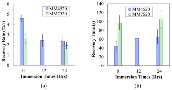 (a) Recovery rate for MM4520 and MM7520 with respect to immersion times in water (b) Recovery time for MM4520 and MM7520 with respect to immersion times in water.