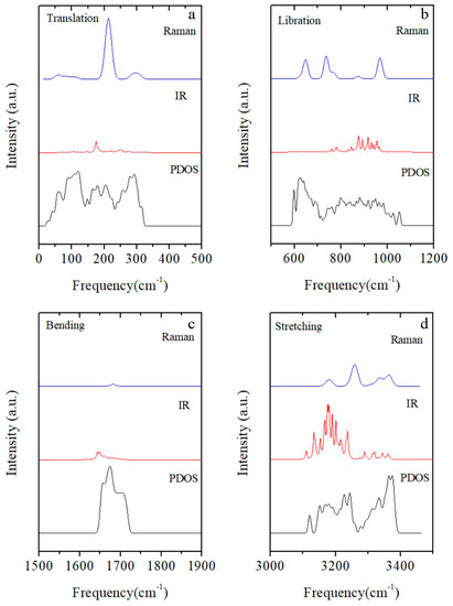 Because of the wide range of spectral intensities of Raman and IR, Figure 2 presents four sections of each of the spectra separately for comparison, on appropriately adjusted intensity scales. For a unit cell containing 34 molecules, there are 34 × 3 × 3 − 3 = 303 optical normal vibration modes. To illustrate the dynamic process of the normal modes, some typical modes of each section are presented for discussion.